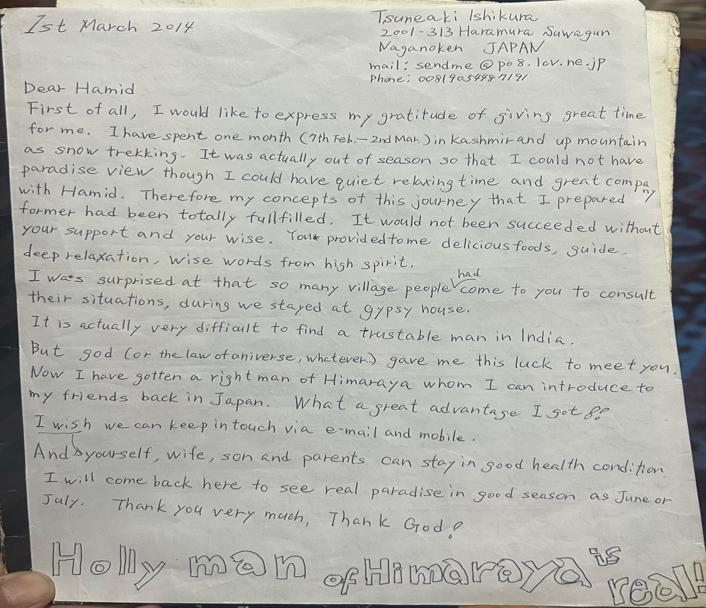 Dear Hamid, First of all, I would like to express my gratitude of giving great time for me. I have spent one month (7th Feb – 2nd Mar.) in Kashmir and up mountain as snow trekking. It was actually out of season so that I could not have paradise view though I could have quiet relaxing time and great company with Hamid. Therefore my concepts of this journey that I prepared former had been totally fulfilled. It would not been succeeded without your support and your wise. You’re provided to me delicious foods, guide, deep relaxation, wise words from high spirit. I was surprised at that so many village people had come to you to consult their situations, during we stayed at gypsy house. It is actually very difficult to find a trustable man in India. But god (or the law of universe, whatever) gave me this luck to meet you. Now I have gotten a right man of Himalaya whom I can introduce to my friends back in Japan. What a great advantage I got!! I wish we can keep in touch via e