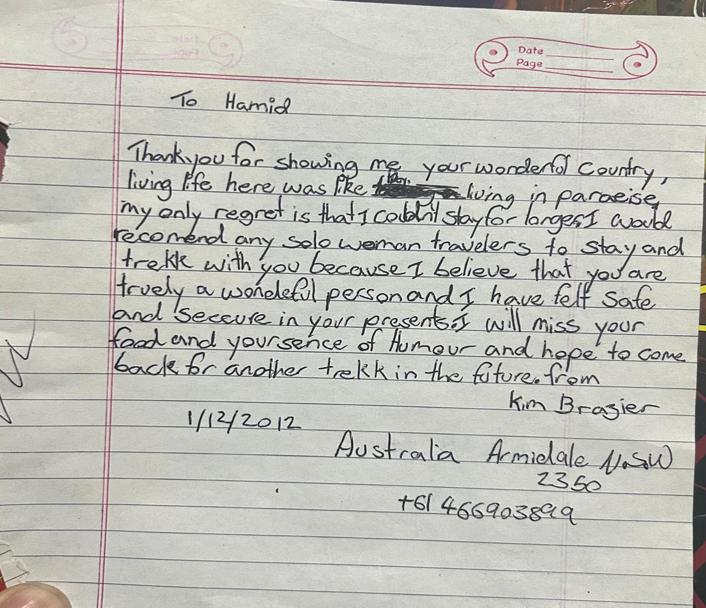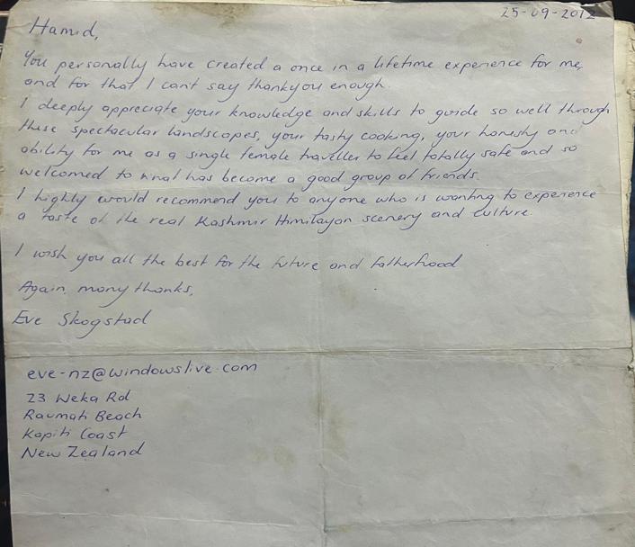 Hamd, You personally have created a once in a lifetime experience for me, and for that I can’t say thank you enough. I deeply appreciate your knowledge and skills to guide so well through these spectacular landscapes, your tasty cooking, your honesty and ability for me as a single female traveller to feel totally safe and so welcomed to what has become a good group of friends. I highly would recommend you to anyone who is wanting to experience a taste of the real Kashmir Himalayan scenery and culture. I wish you all the best for the future and fatherhood. Again many thanks,
