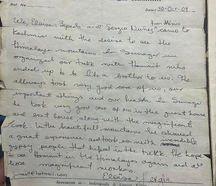 We, Eloisa Zepeda and Sergio Nunez (from Mexico) came to Kashmir with the desire to see the Himalaya mountains. In Srinagar, we organized our trek with Hammit who ended up to be like a brother to us. He always took very good care of us, our important things and our health. In Srinagar he took very good care of us in the guest house and boat house, along with the magnificent cook. In the beautiful mountains he showed a great experience and took us with incredible gypsy people that helped in the trek. We hope to see Hammit in the Himalayas again and see those magnificent mountains.